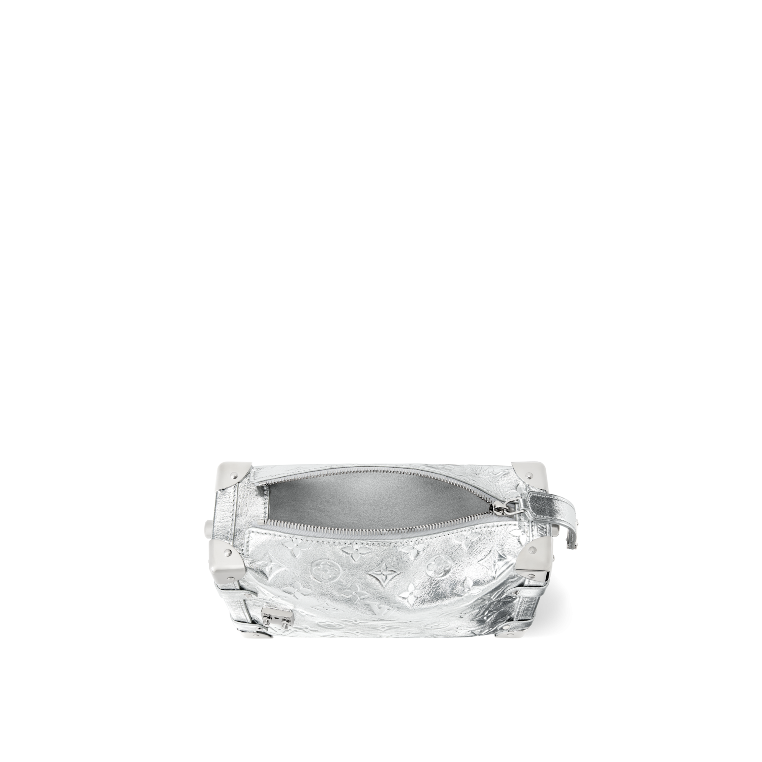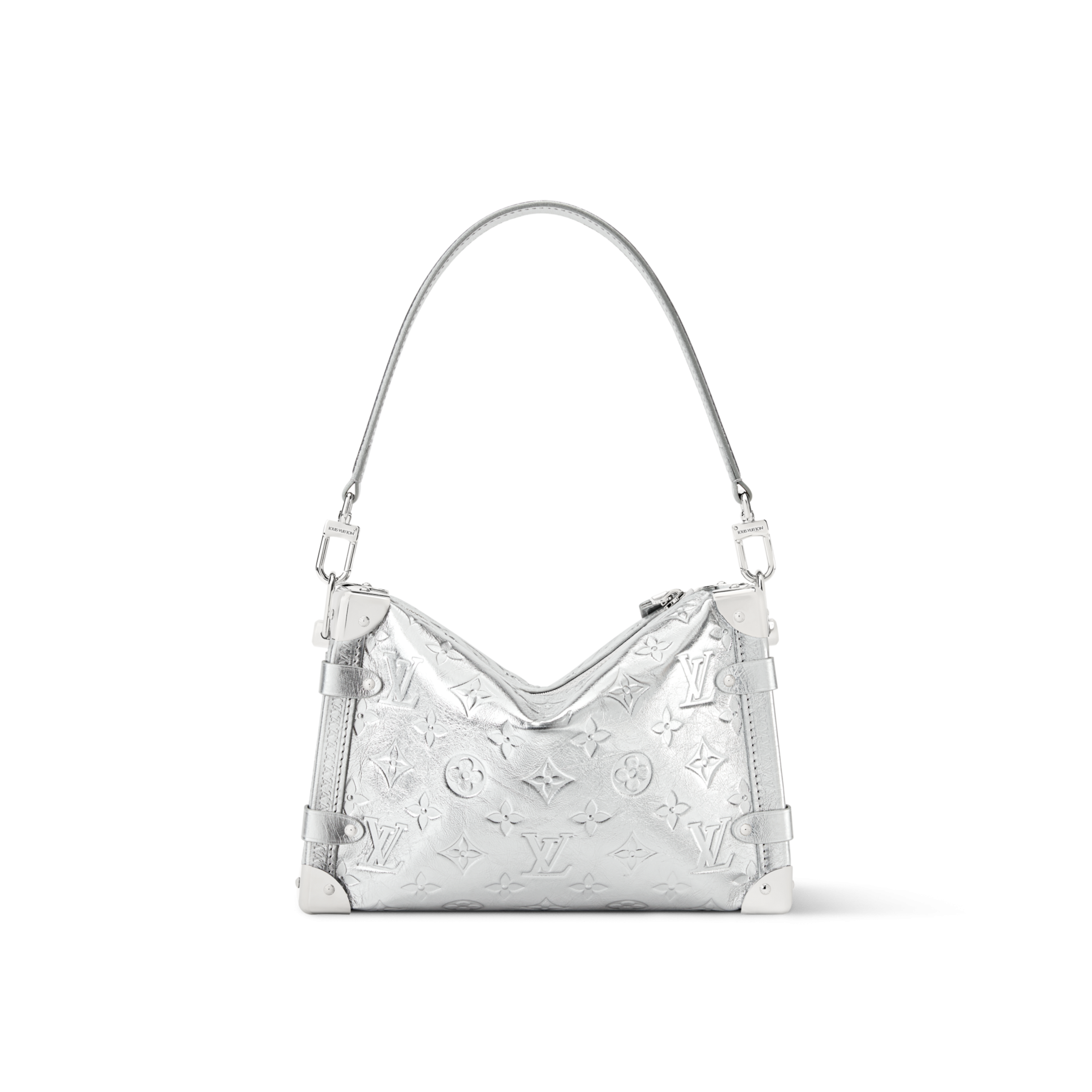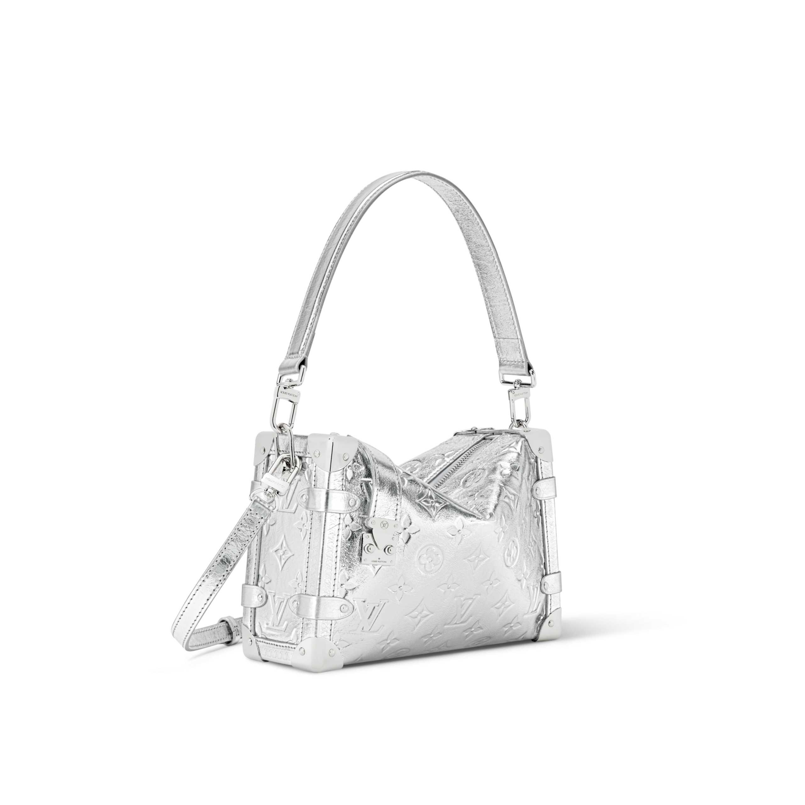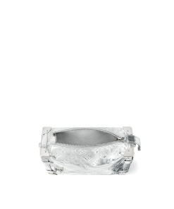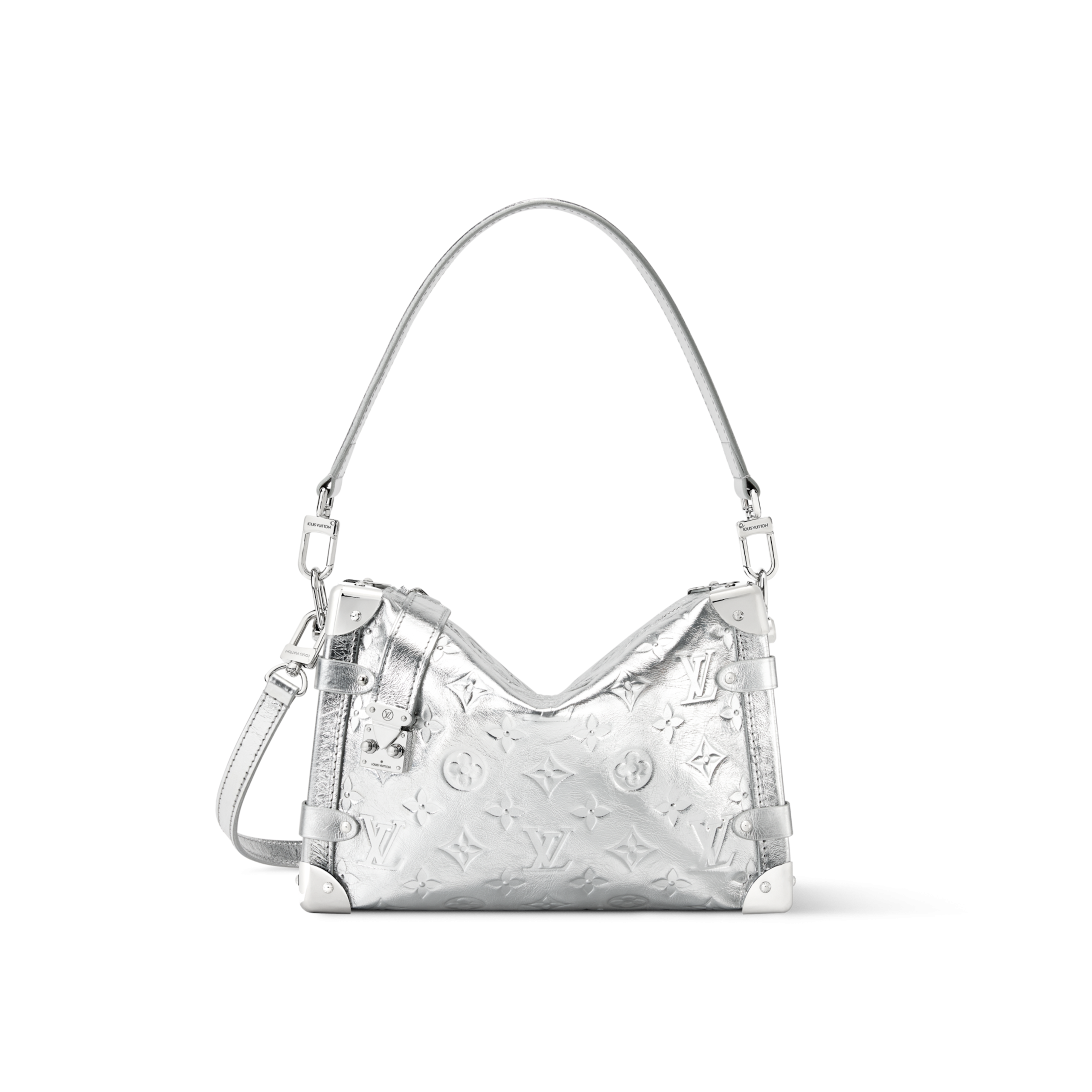 An elegant après-ski option, this Monogram Miroir Side Trunk MM makes a fashion statement with its light-catching finish. It is crafted from leather in a bold Silver colorway that adds a futuristic feel, and is adorned with a signature S-lock in a tonal finish. Echoing the original design, this seasonal edition includes metallic corners, paying tribute to the House’s luggage-making heritage. A day-to-evening bag that transitions effortlessly from winter outings to sophisticated soirées.